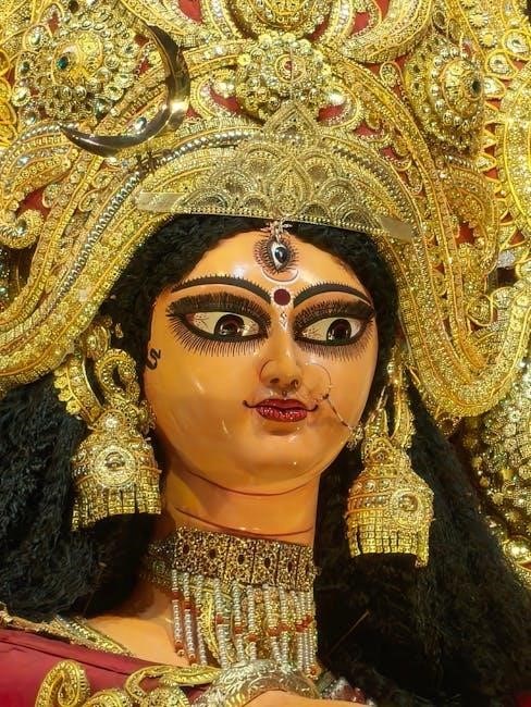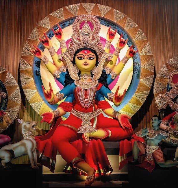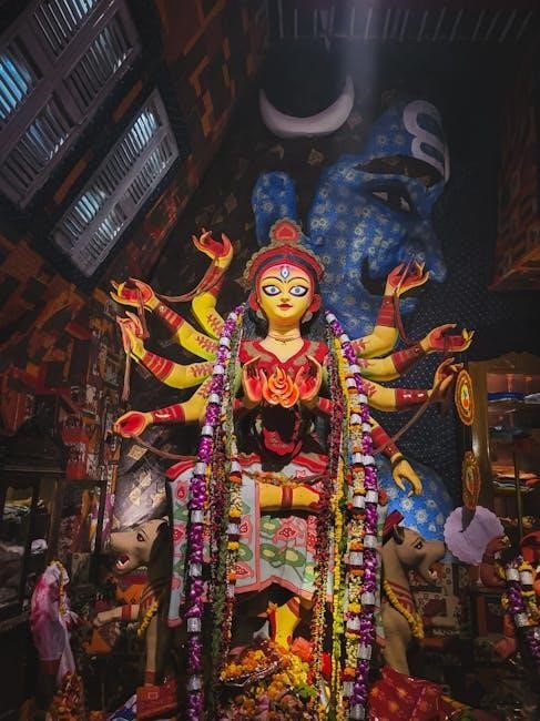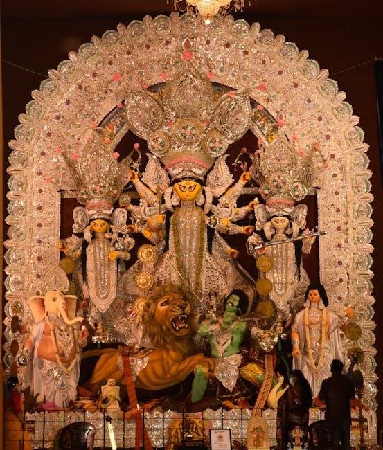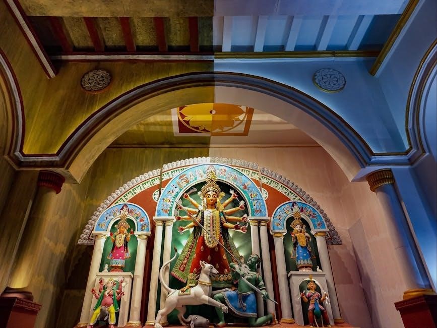 Arrangements for the puja materials – fruits‚ flowers‚ incense‚ and prasad – are made around the deity. Backdrop cutouts for puja‚ as suggested by LoveNspire‚ can further enhance the sacred ambiance‚ creating a focused and reverent space for worship‚ as detailed in the PDF.